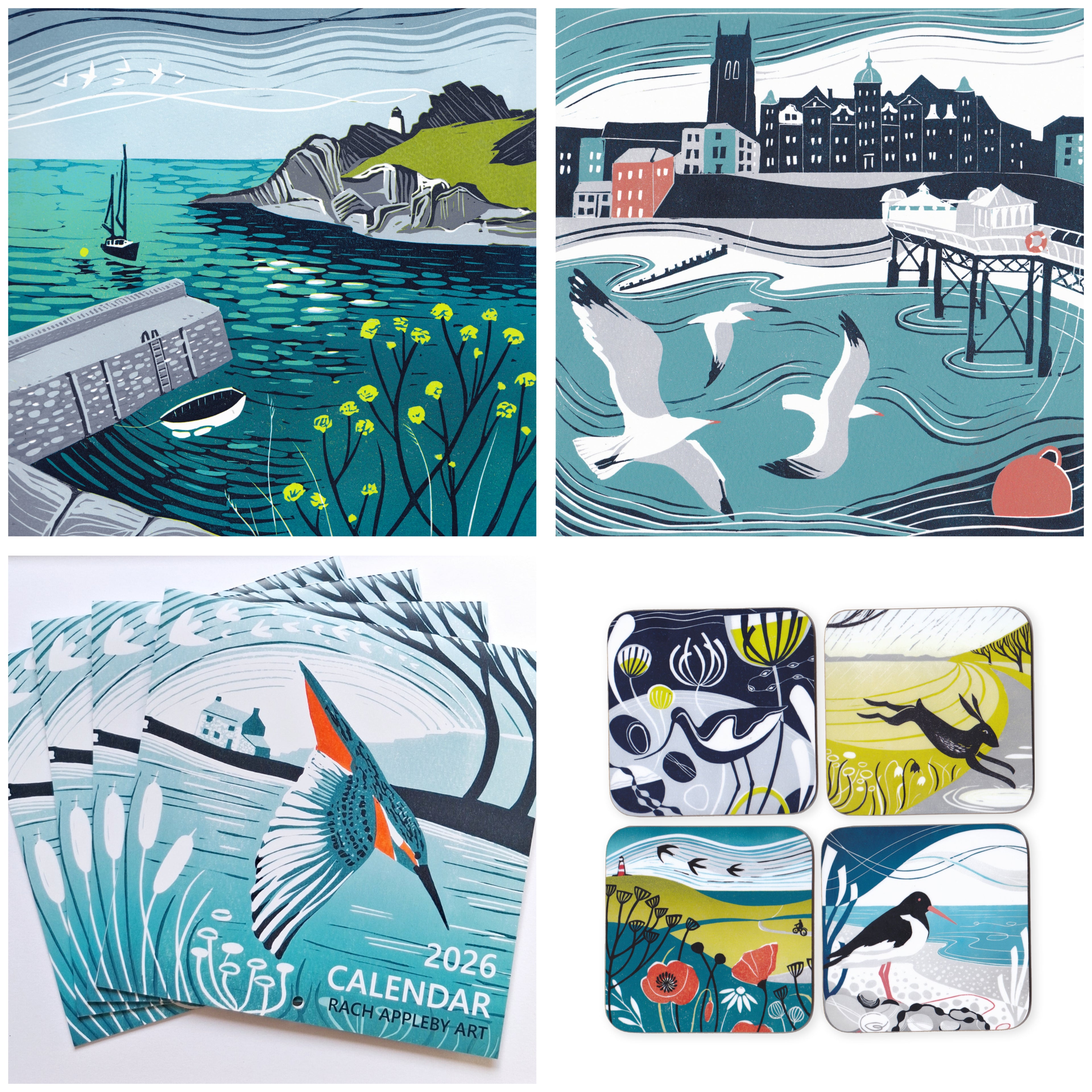 Set of 4 Coasters - Lino Print Designs