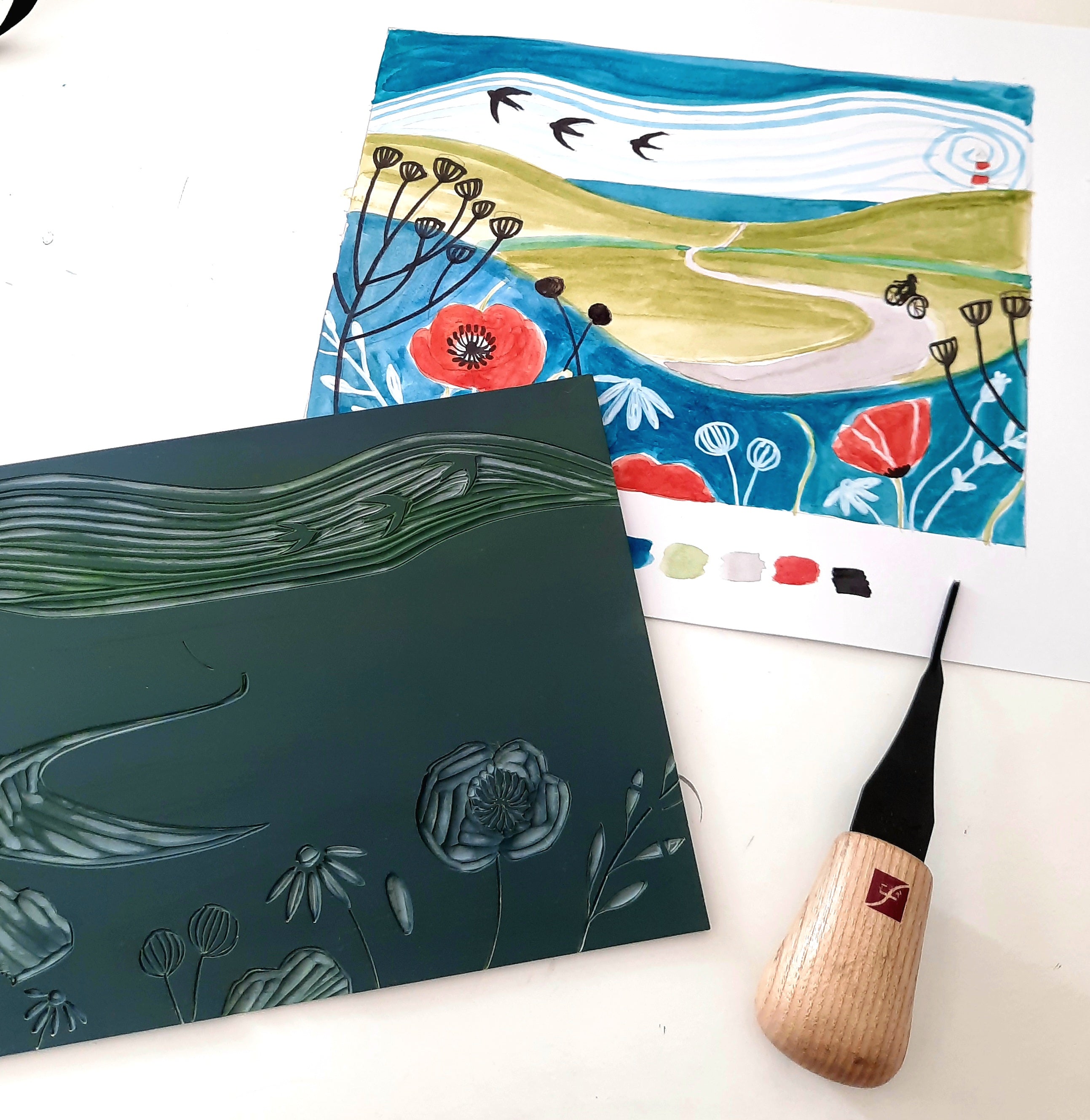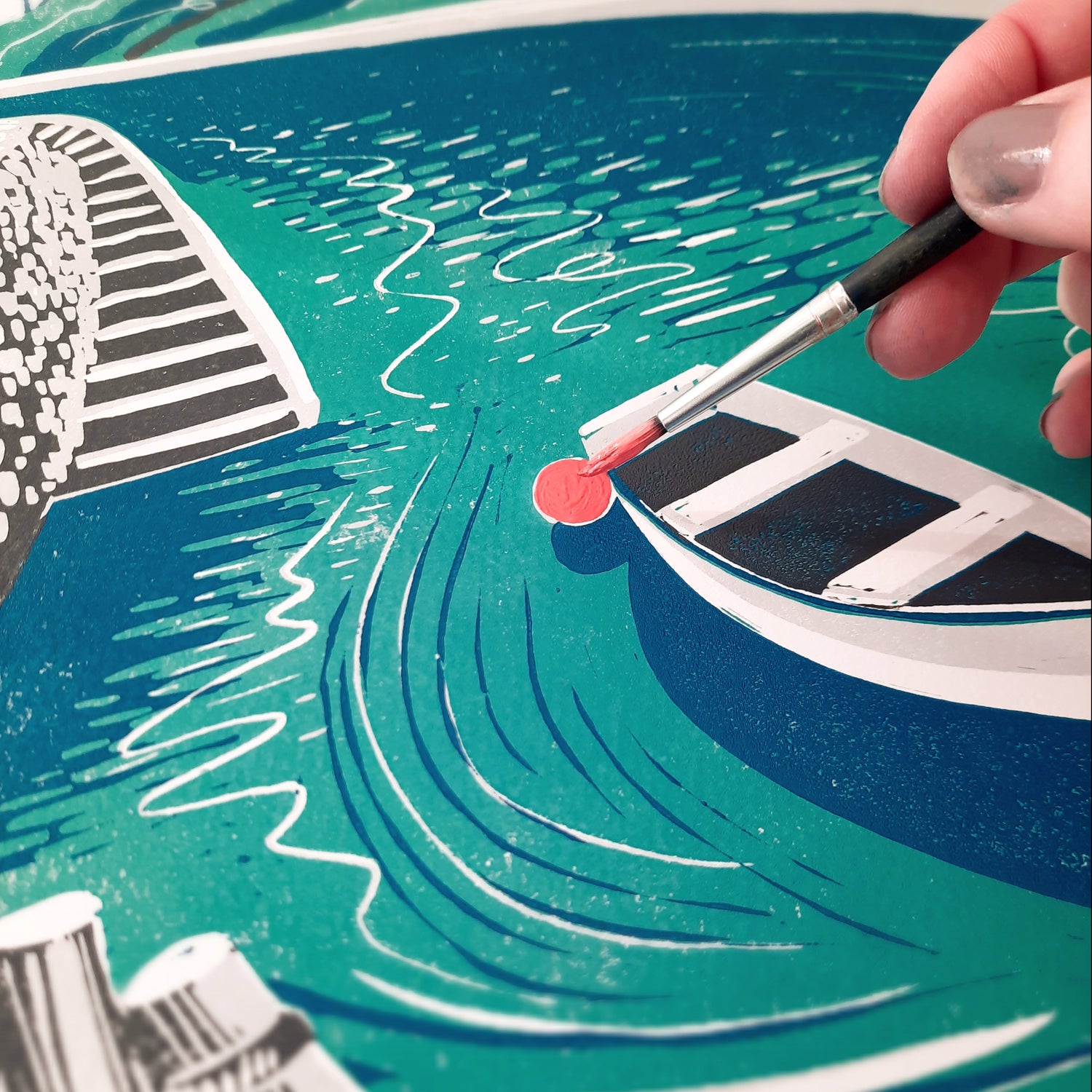 Since starting her small business in 2020, Rachel has continued to push her creative practice, selling work in galleries, taking part in makers markets and exhibitions as well as working on unique commission projects. Her love of the sea is most evident in her style of work, capturing many coastal locations through lino print and oil paint. Themes of home, memories, places and the natural landscape are represented in her signature, stylised way of working.