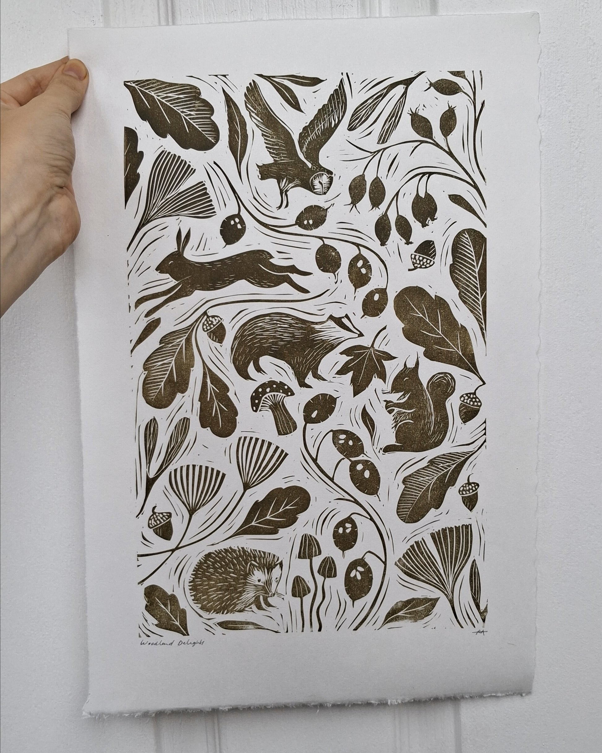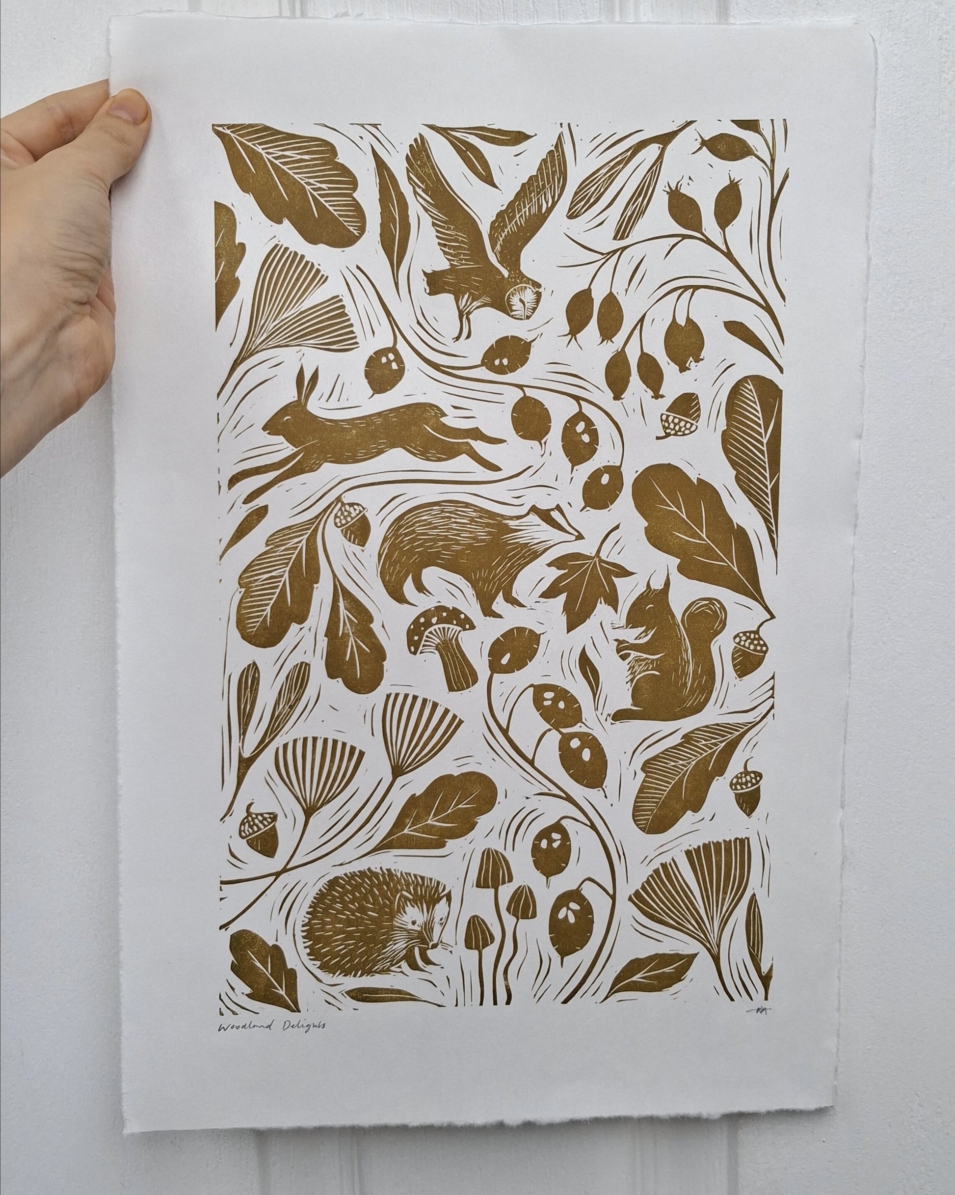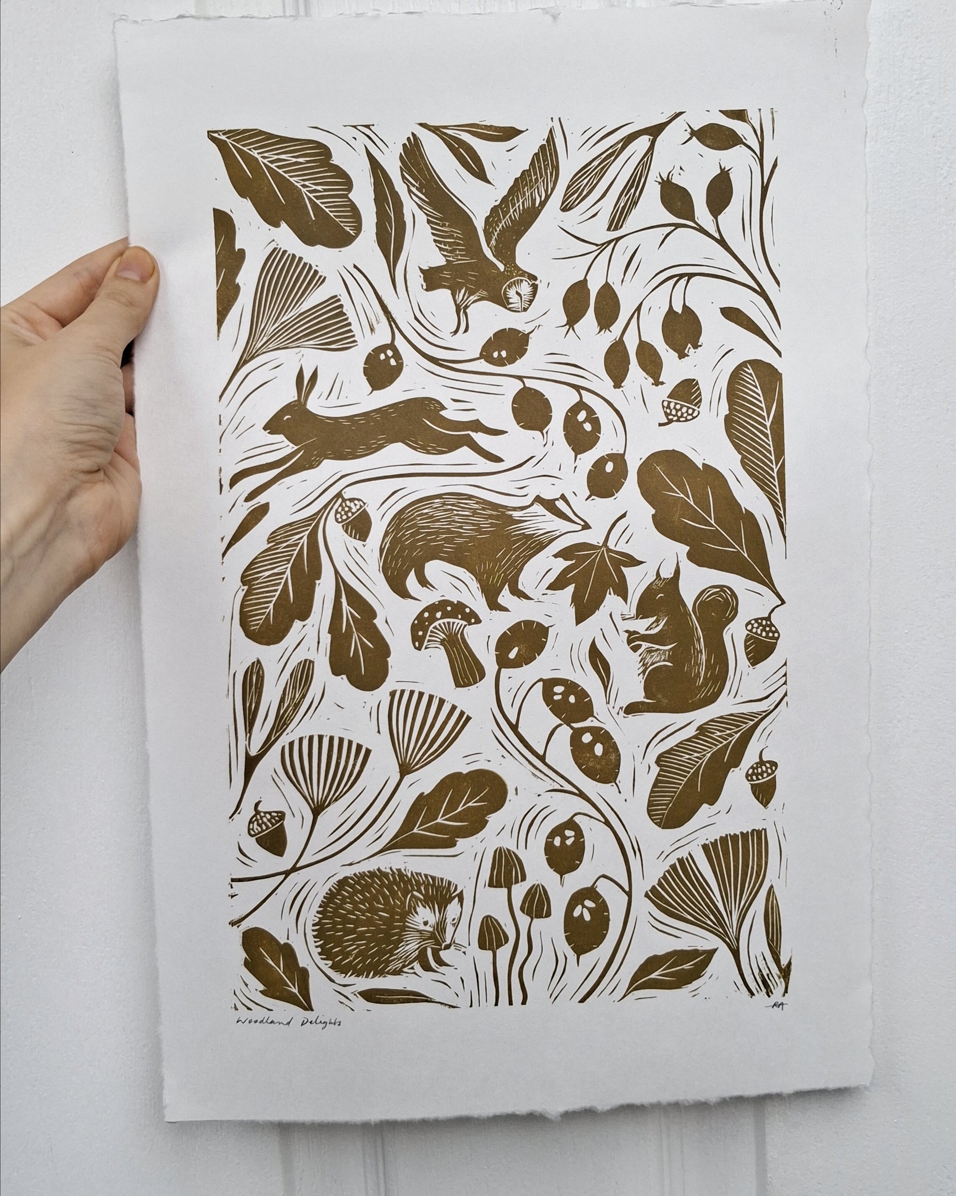 Autumn Delights is an original lino print capturing the flora and fauna of the season. It features badgers, hares, squirrels as well as oak leaves, acorns and mushrooms. Only a few available for now.