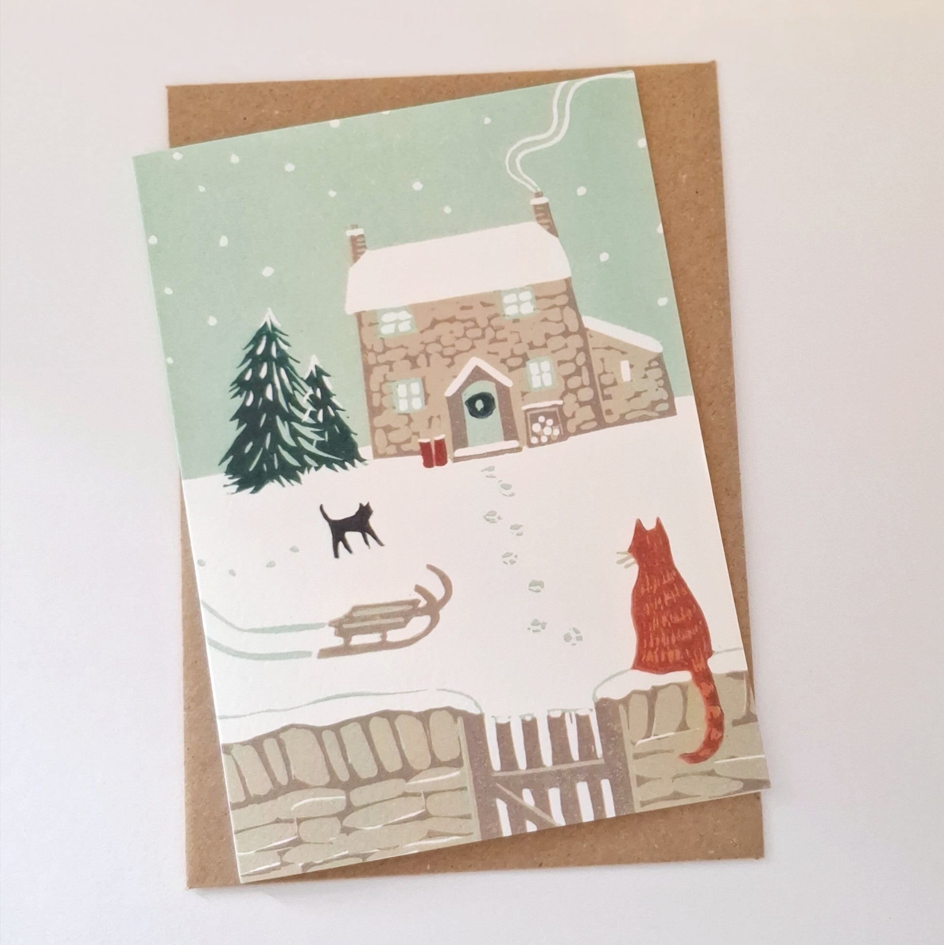 The original design was created using traditional printmaking techniques and captures a wintery cottage scene with two cats out in the snow.