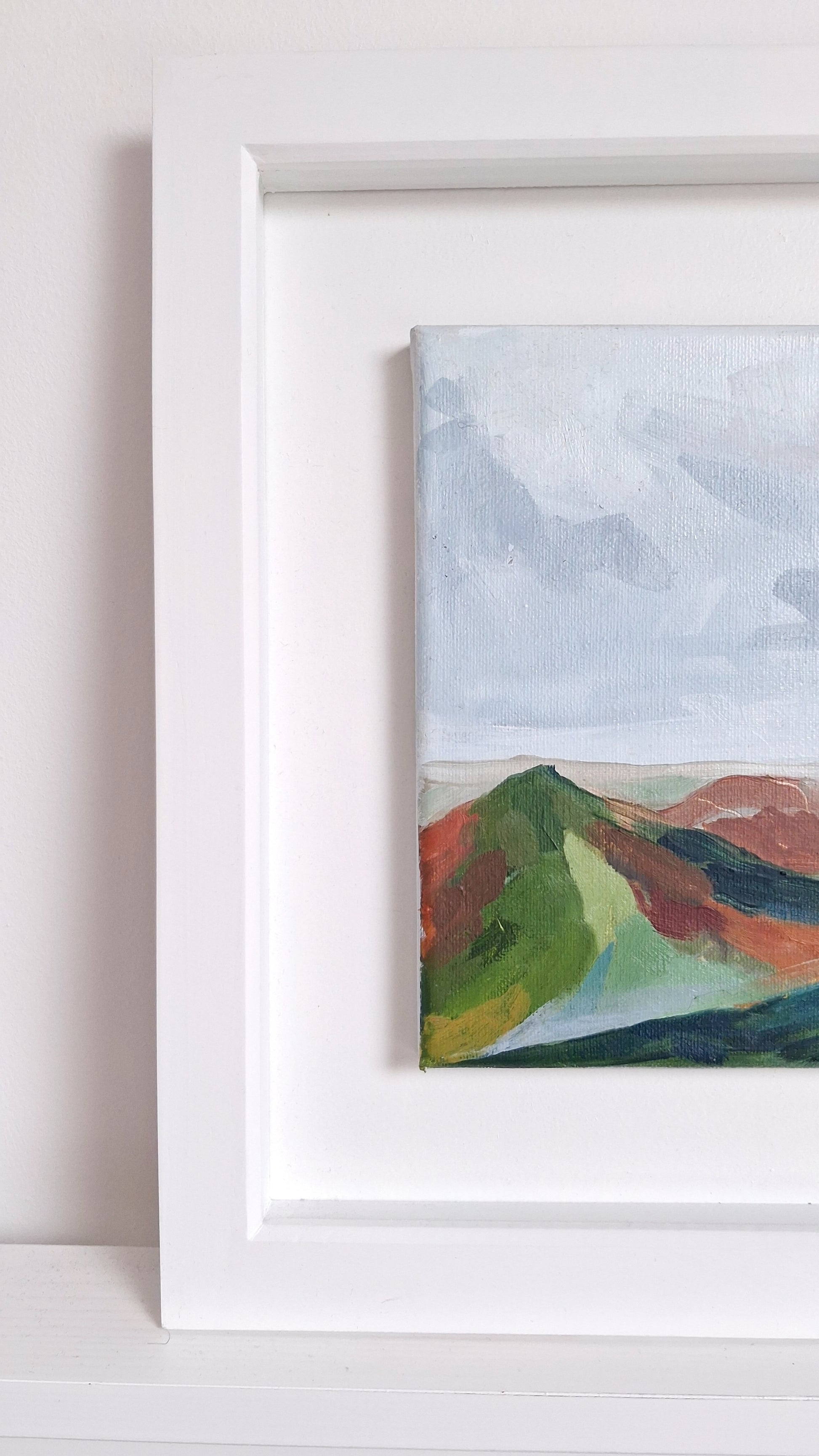 Hilltops is an original mixed media on canvas painting. It is inspired by a trip to Wales last November, climbing up a hill on a misty walk to some castle ruins.