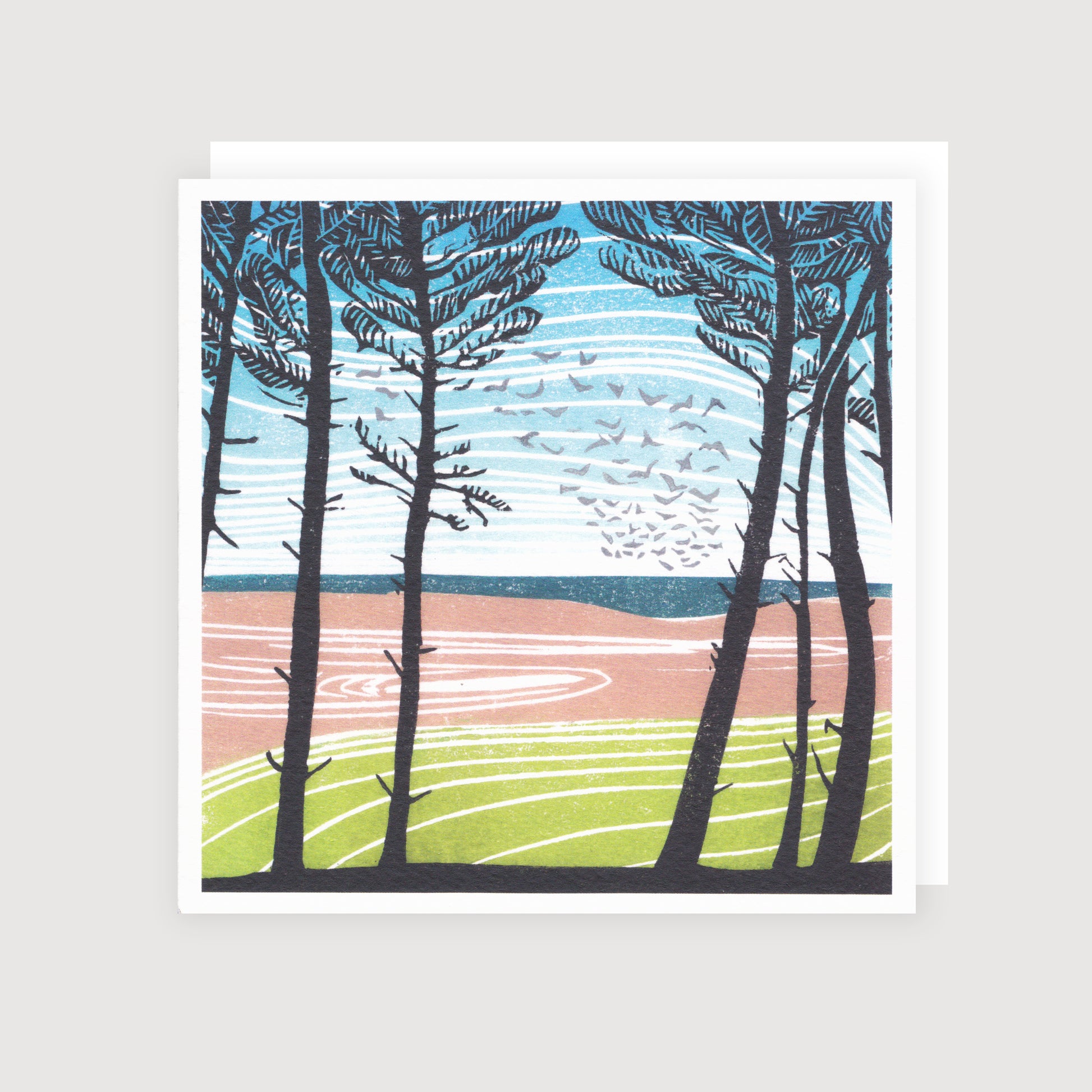 The original design was created using traditional printmaking techniques and is inspired by views from the pine trees across the beautiful landscape at Holkham on the North Norfolk Coast.