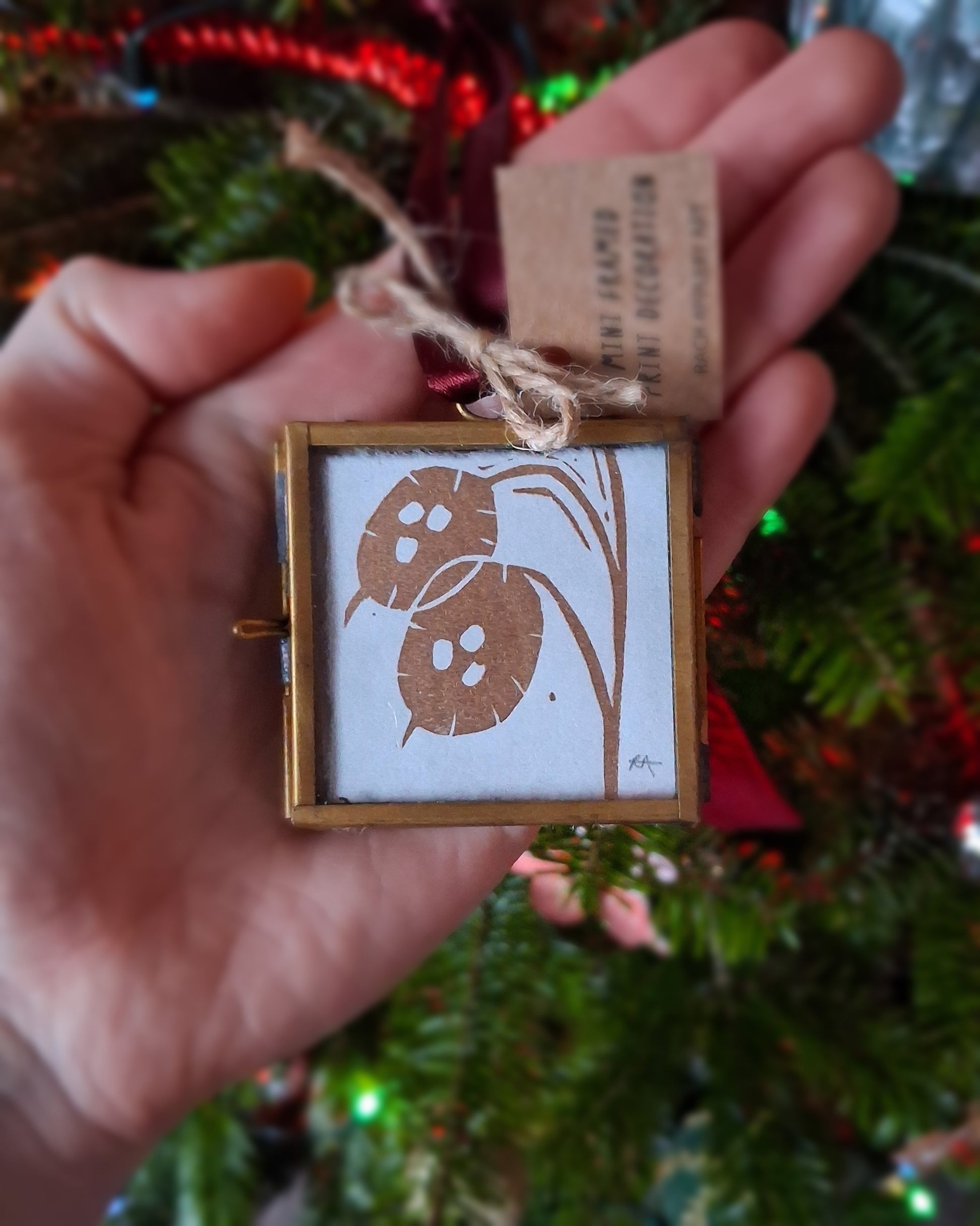 Mini lino print brass frame Christmas decorations. Tiny Christmas images printed in copper ink onto awagami printing paper. These make a great little stocking filler!