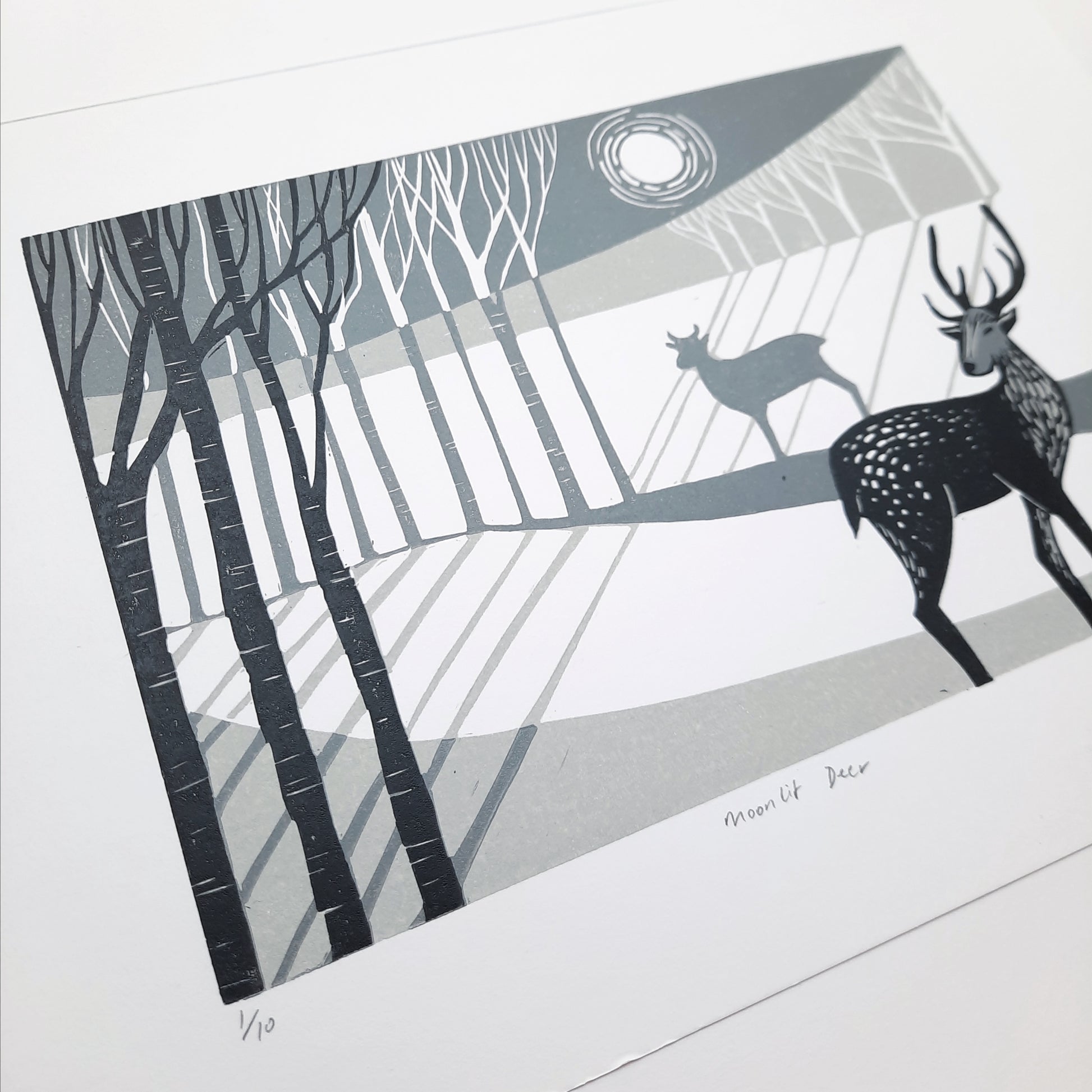 Moonlit Deer is an original lino print created in 2024. The stylised monochrome design captures two deer in the woodland set against the glow of the moon using 3 layers of ink.
