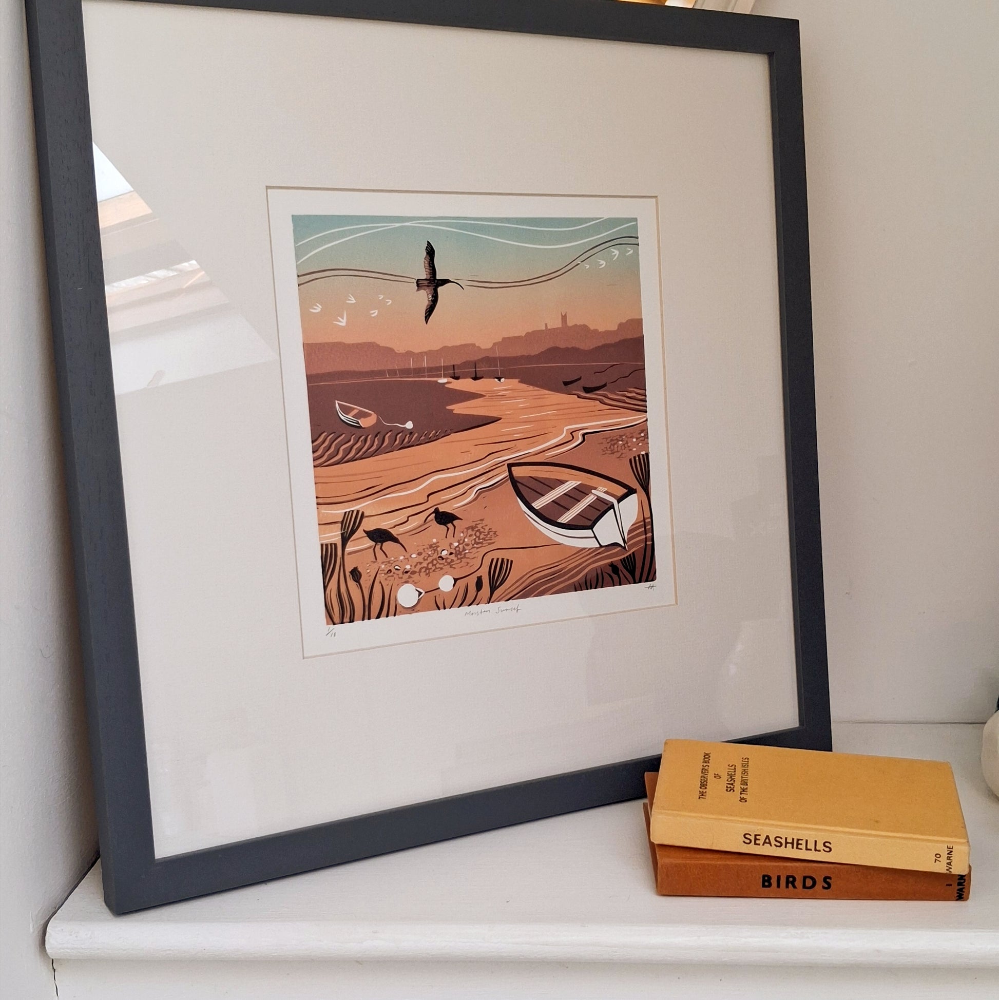 Morston Sunset is an original framed lino print capturing a popular view from Morston, Norfolk looking towards Blakeney. The print features curlews on the river bank and one flying overhead as the sun dips behind the horizon. It is a limited edition of 18.