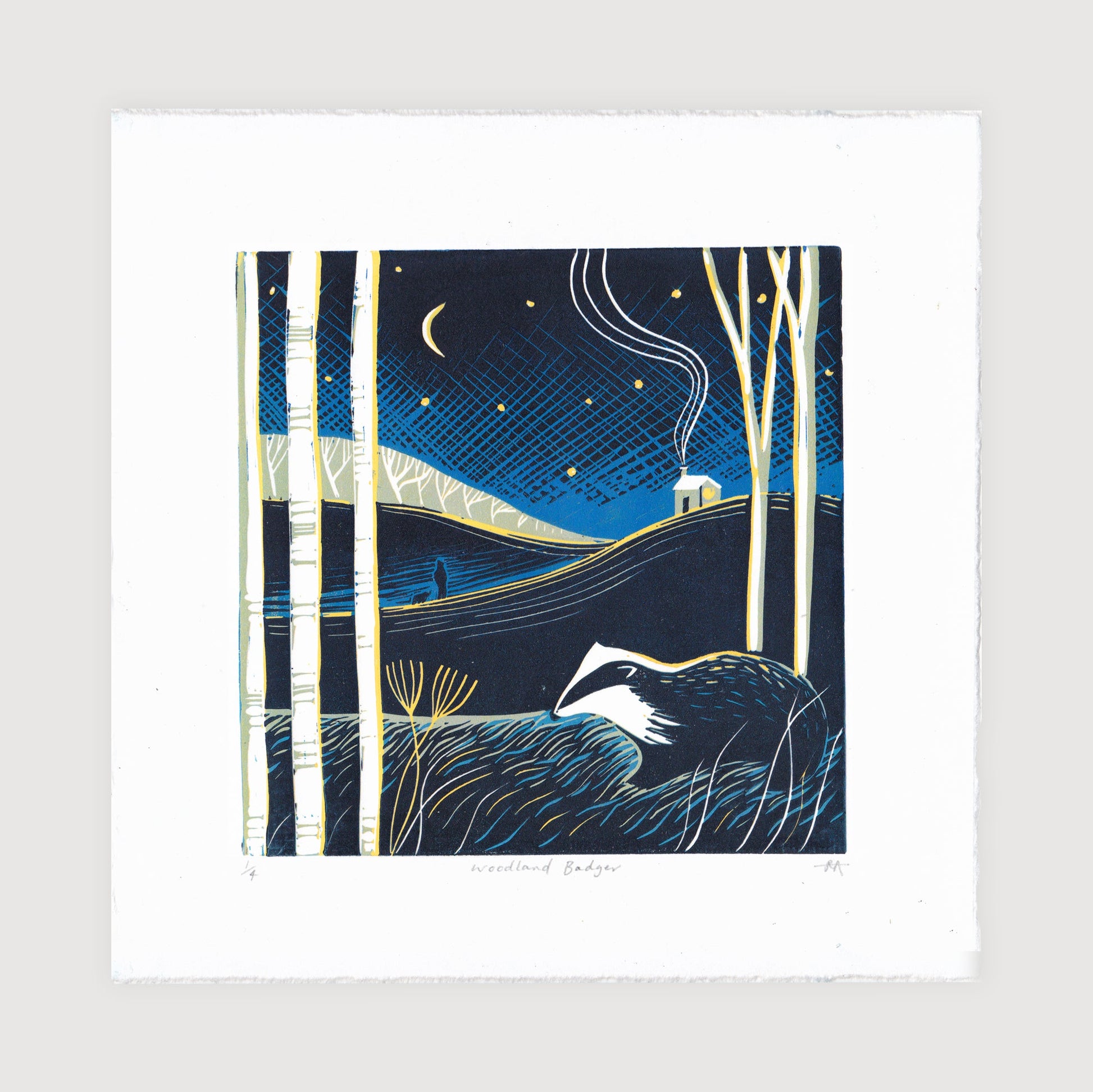 Woodland Badger is an original lino print capturing a curious badger emerging from the woodland. I have 4 test print seconds available: