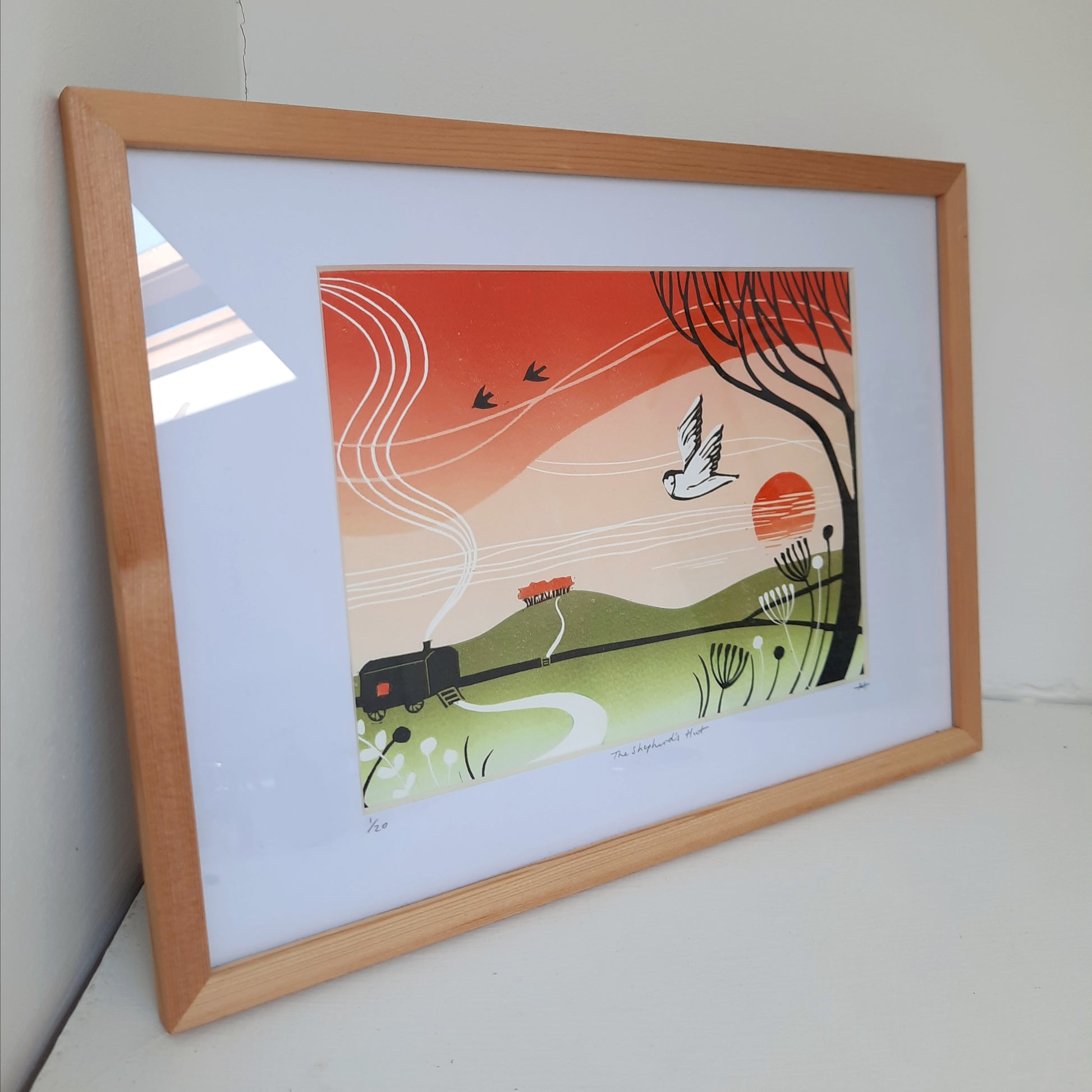 An original framed lino print inspired by Autumnal weekends spent in the Derbyshire Dales. See unframed print here.