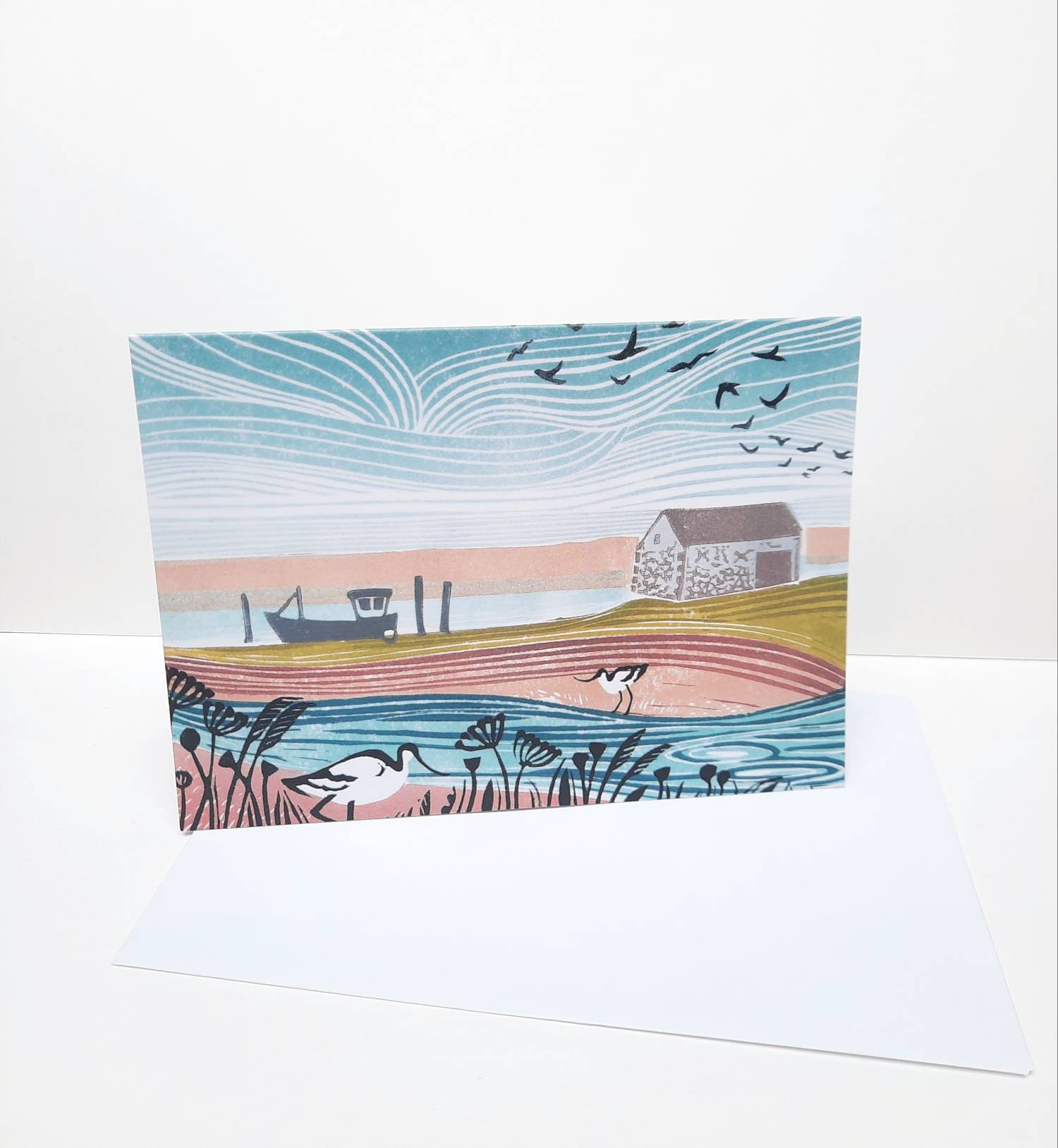 'Thornham Avocets' greetings card A6 - Reproduction print from an original linocut.