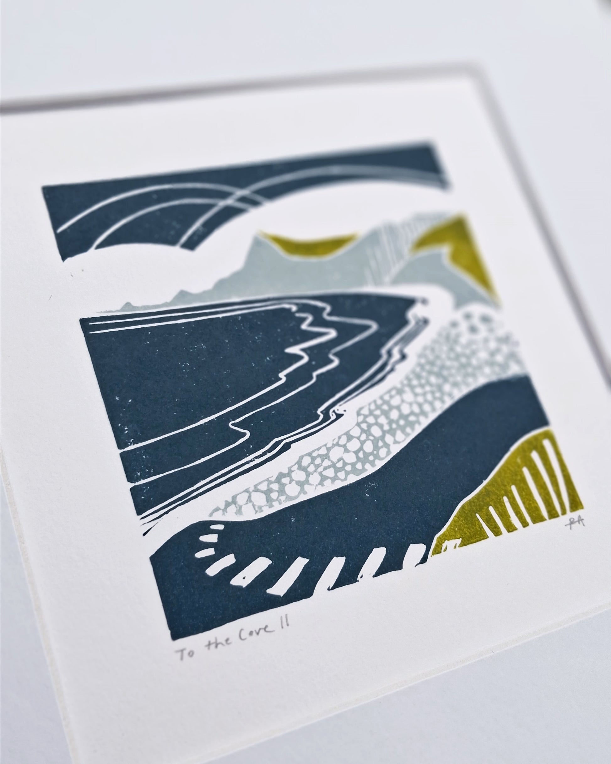 To The Cove II is an original lino print capturing a view of a cove on the Devon coast. Printed in a new colourway.
