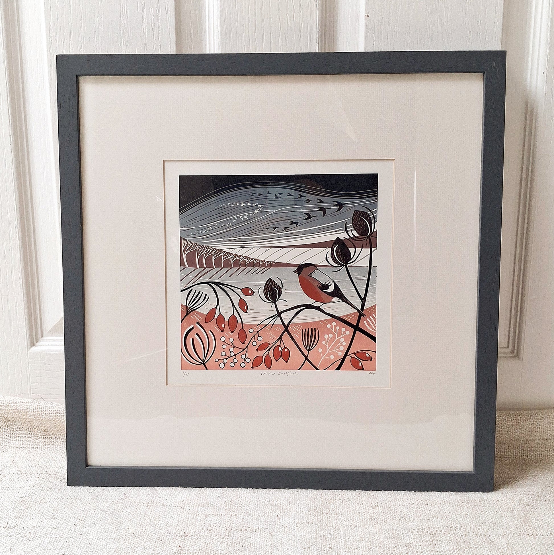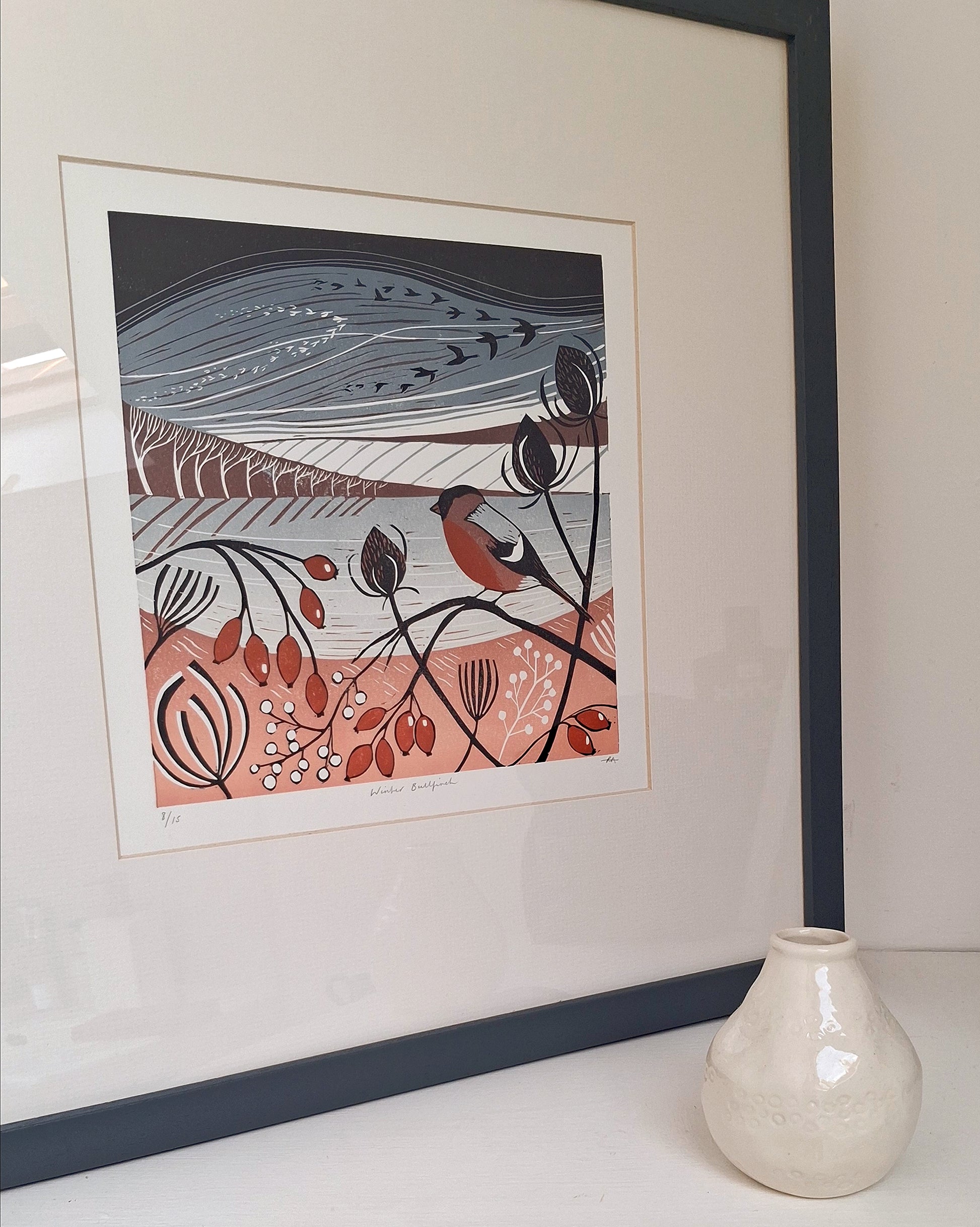 Winter Bullfinch is an original framed lino print inspired by cold Winter walks in my local area. It captures a frozen over flooded field, some snow on the hills and the last of the berries hanging on the bushes. A bullfinch is perched in the foreground amongst the teasels and geese fly overhead.